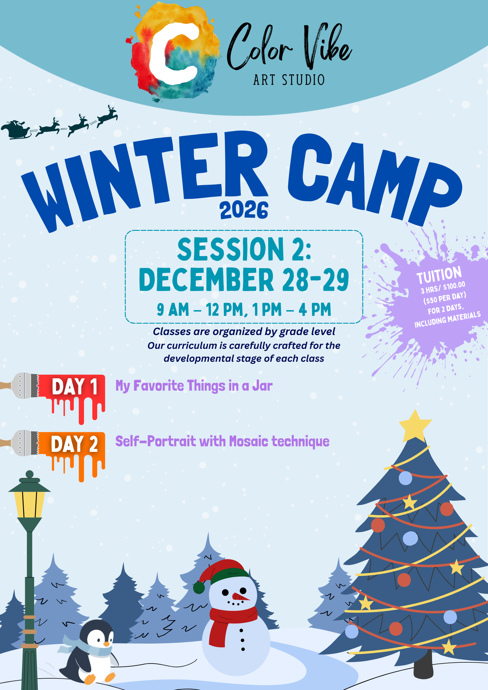 ‘“This winter break, let’s get messy! Our art camp is a whirlwind of color, creativity, and fun. Your child will spend their days splattering, sculpting, and smiling from ear to ear. Our Art Camp is the perfect place for young artists to explore their imagination, build confidence, and create artwork they’re proud of!